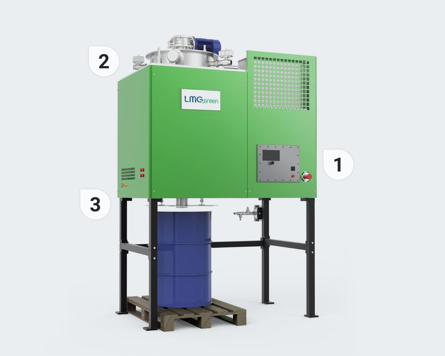 Discharge of the hot residue without waiting time, in total safety, prepared for commercial or IBC 200-liter barrel.